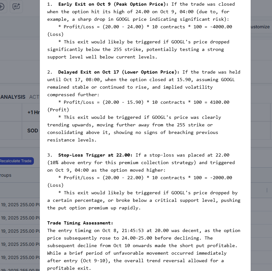 - What if exit scenarios based on candle stick patterns, chart patterns that could have been taken during the trade
