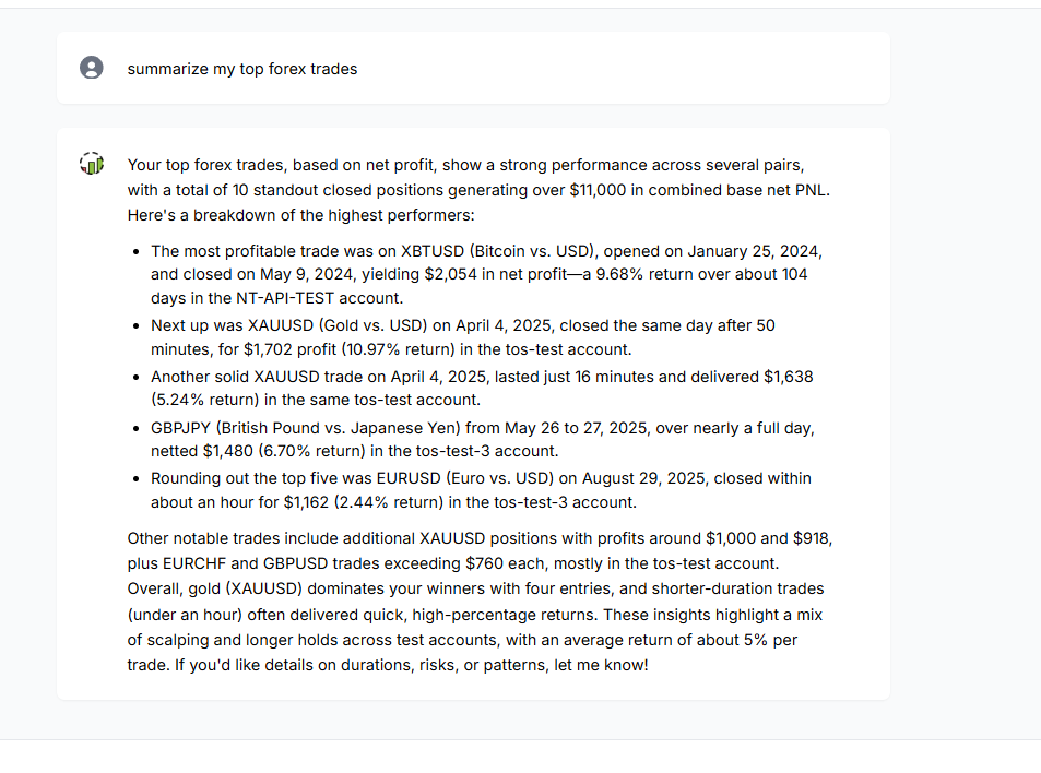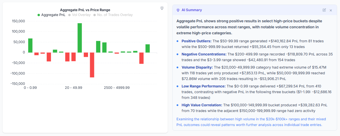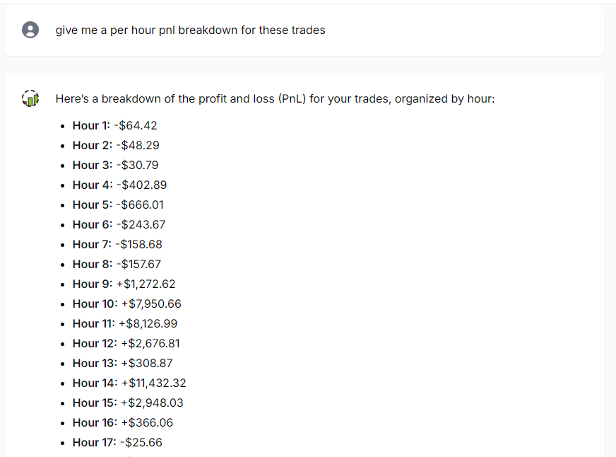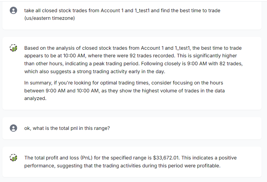 We have greatly improved the CoT system, accuracy, and the understanding capabilities of the AI trade chat. Your chats will now be much faster, more insightful. Along with these improvements, we have also extended the summarization capability of the AI trade chat to charts and tables. For now, this is only available for the PnL charts under trades analysis and the tables under "Tables" section (trades table, symbol table, tag table, day table, executions table). For charts, click on the small light bulb icon at the top right corner to see interesting insights based on all the chart data.