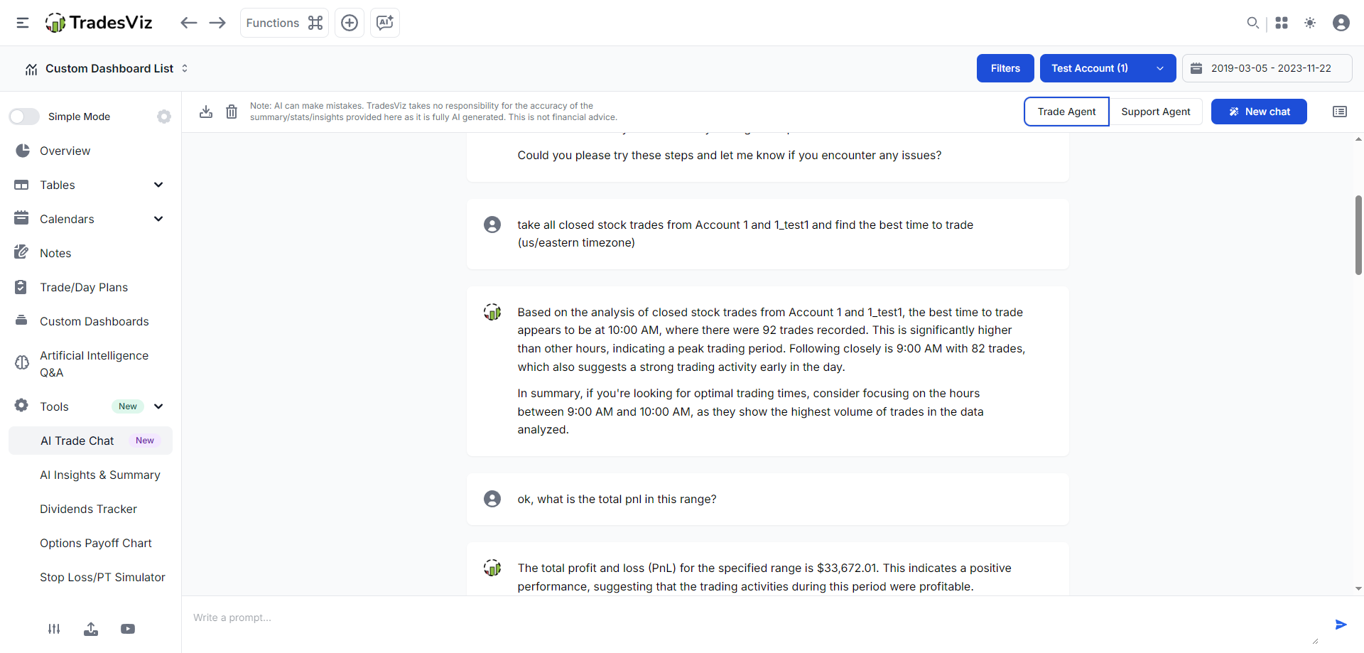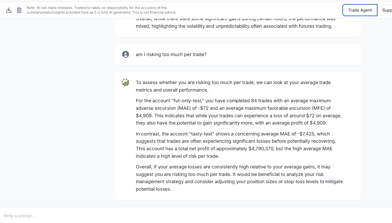 All the AI features on TradesViz are carefully built to provide utility - not for mere marketing purposes and we've proven this utility through 1000s of positive trader feedback and by solving real problems using state-of-the-art AI models. We hope the Trade AI chat once proves to be even more effective than the AI Q&A feature, as this is an unstructured, non-error-prone interface. Any suggestions, improvements to be made, or new features you want us to add? Please let us know by emailing us at [email protected]!