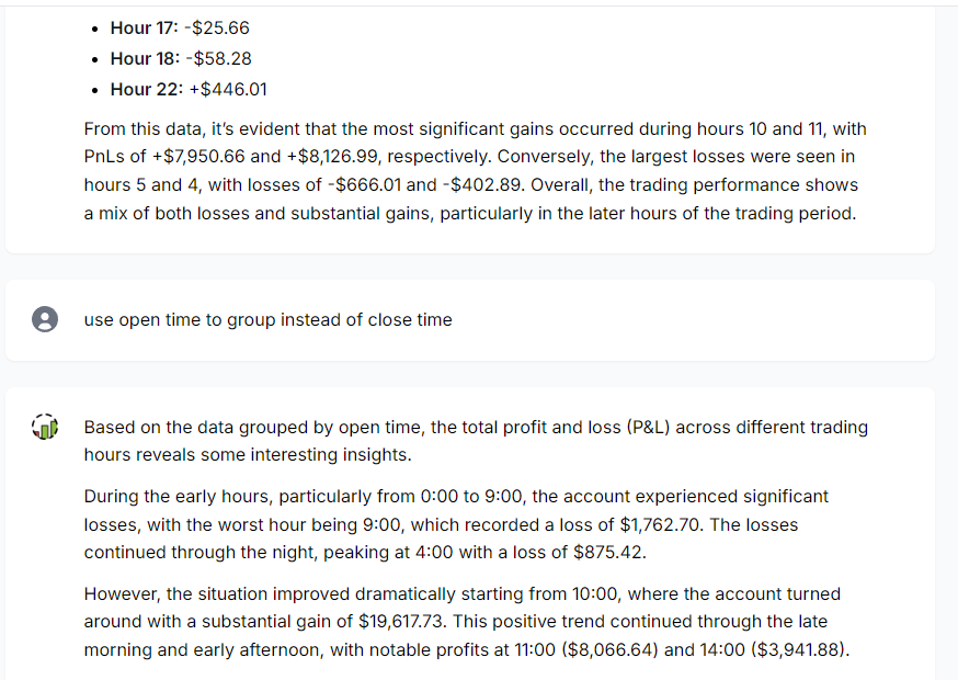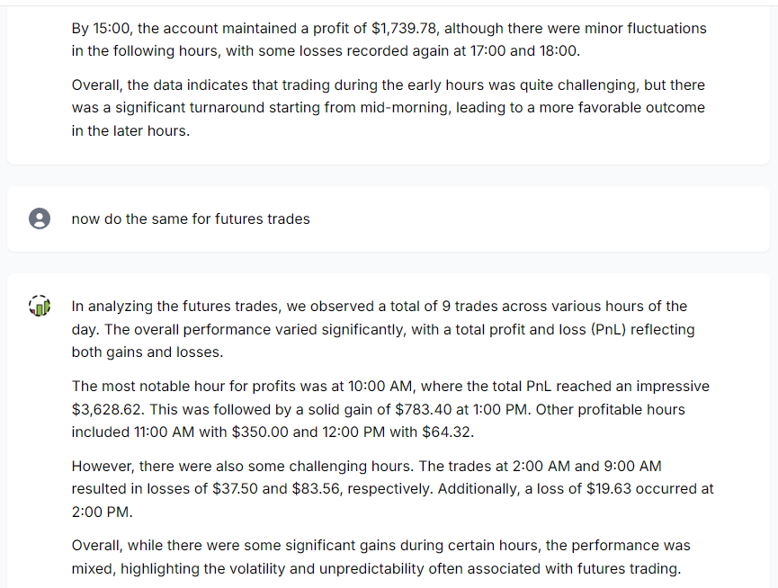 During this conversation, the context of the trading account and the list of trades to be used were preserved, and internally, the chain-of-thought made sure the system adhered to the instructions and the context (CoT also helps in automated error correction in some cases).
