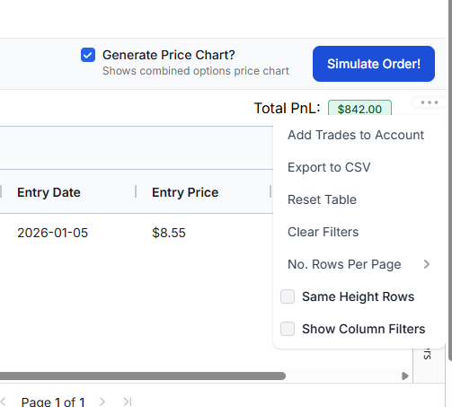 You can now directly add your trades/execution to your trading account when backtesting to write notes on them or even track a trading account of simulated trades. All you have to do after running the simulation is click on the 3 lines icon near the "Total pnl" section of the executions table and click on "Add Trades to Account". Make sure only 1 trading account is selected globally and confirm the prompt that appears.