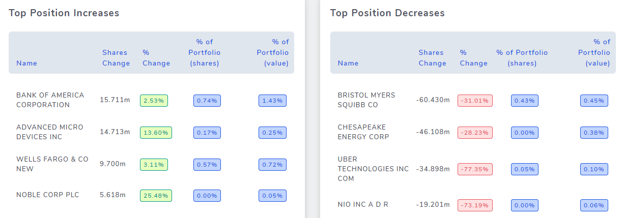The fourth section is also very similar to the third section - it again shows 2 tables, but here, we have focused on the increases and decrease of positions between 2 consecutive quarters. For example, if we are currently viewing 2020 Q3's data, the percentages shown in this section use data from 2020 Q2 and 2020 Q3. This table is very useful in knowing if any recent trend changes caused the company to drop or increase positions in any certain stock. Large drops might mean a severe negative event or that their target has been reached. While there are many interpretations that one could get from these numbers, it's useful to combine this with fundamental data of the stock's company and other general financial news to arrive at a conclusion.