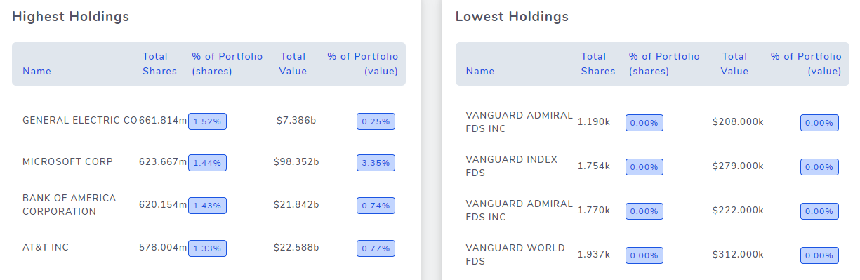 The image above shows the first few sections form the perspective of the stock APPLE and you can clearly see that the highest holdings table unlike the one we saw for VANGUARD is different because there, we see all the companies that have a lot of shares of APPLE under their management. It's another useful insight in deciding if you want to invest in any of these companies.