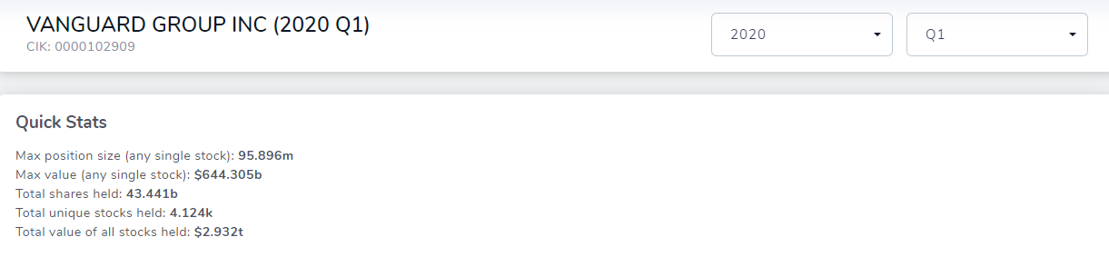 The image below shows the first section which contains just the name of the company, it's CIK number, and the year and quarter selection dropdowns. Following this, in the second section, we see some simple stats about the total quantity and value of shares held by the company. Going forward, we will add more useful information to this area.