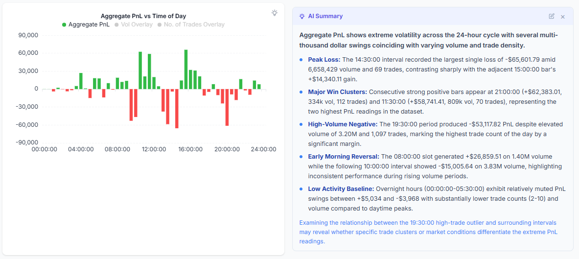 We have greatly improved the CoT system, accuracy, and the understanding capabilities of the AI trade chat. Your chats will now be much faster, more insightful. Along with these improvements, we have also extended the summarization capability of the AI trade chat to charts and tables. For now, this is only available for the PnL charts under trades analysis and the tables under "Tables" section (trades table, symbol table, tag table, day table, executions table). For charts, click on the small light bulb icon at the top right corner to see interesting insights based on all the chart data.