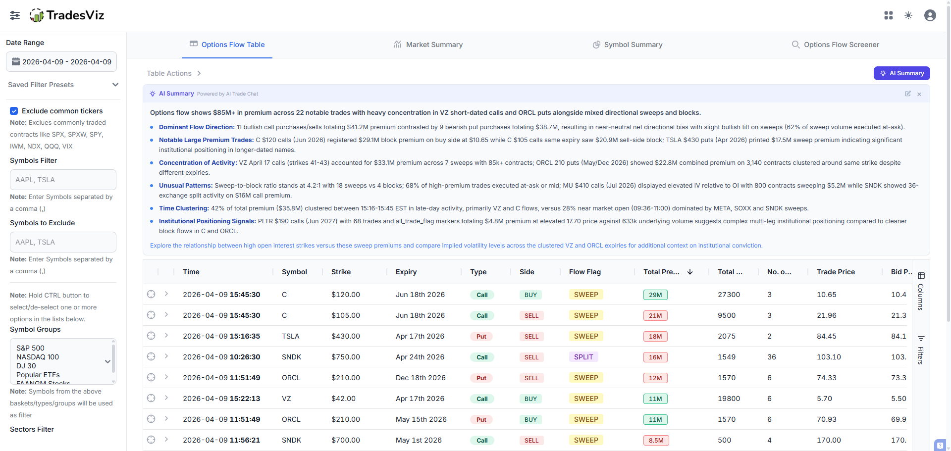 - AI Summary for Options Flow: One-click AI-generated summaries for options flow data. Get an instant natural-language breakdown of unusual options activity without manually parsing the charts.