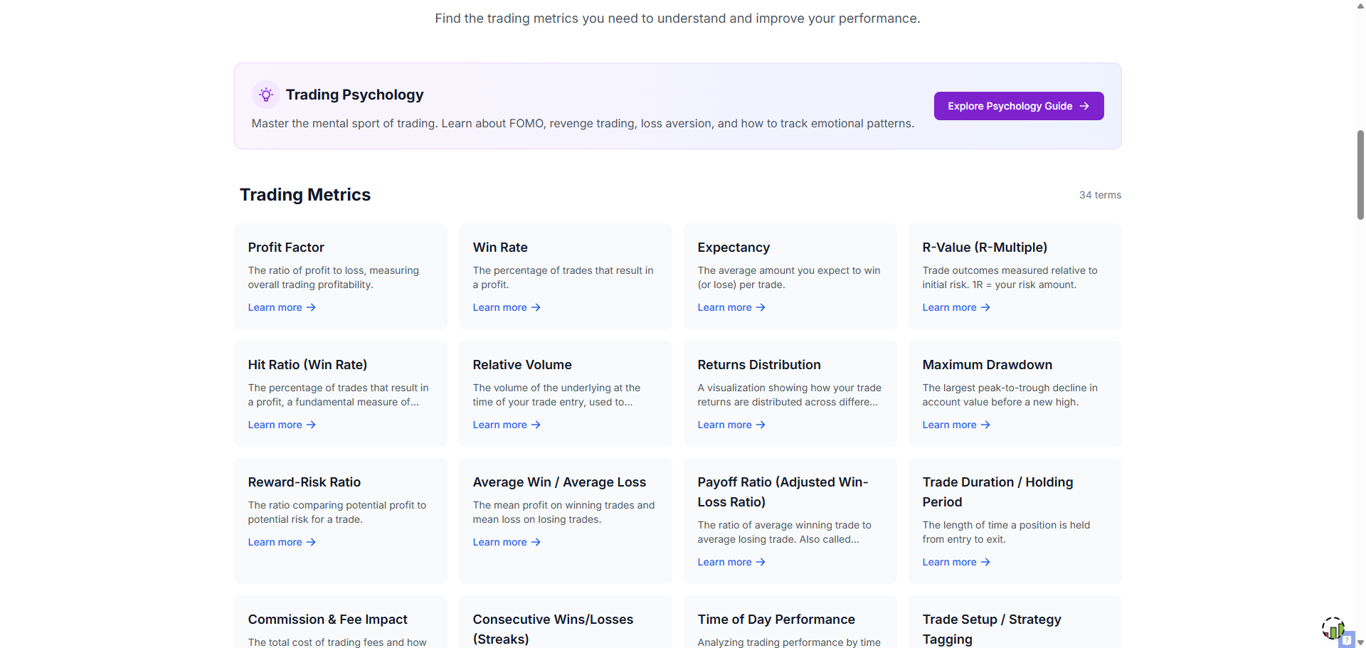 - "No education" - False. We have published 150+ in-depth blog posts, guides, and tutorials covering everything from R-values and profit factors to trading psychology tracking to candlestick pattern backtesting with real data. We don't paywall education behind a branded "university" - it's all free and publicly accessible.