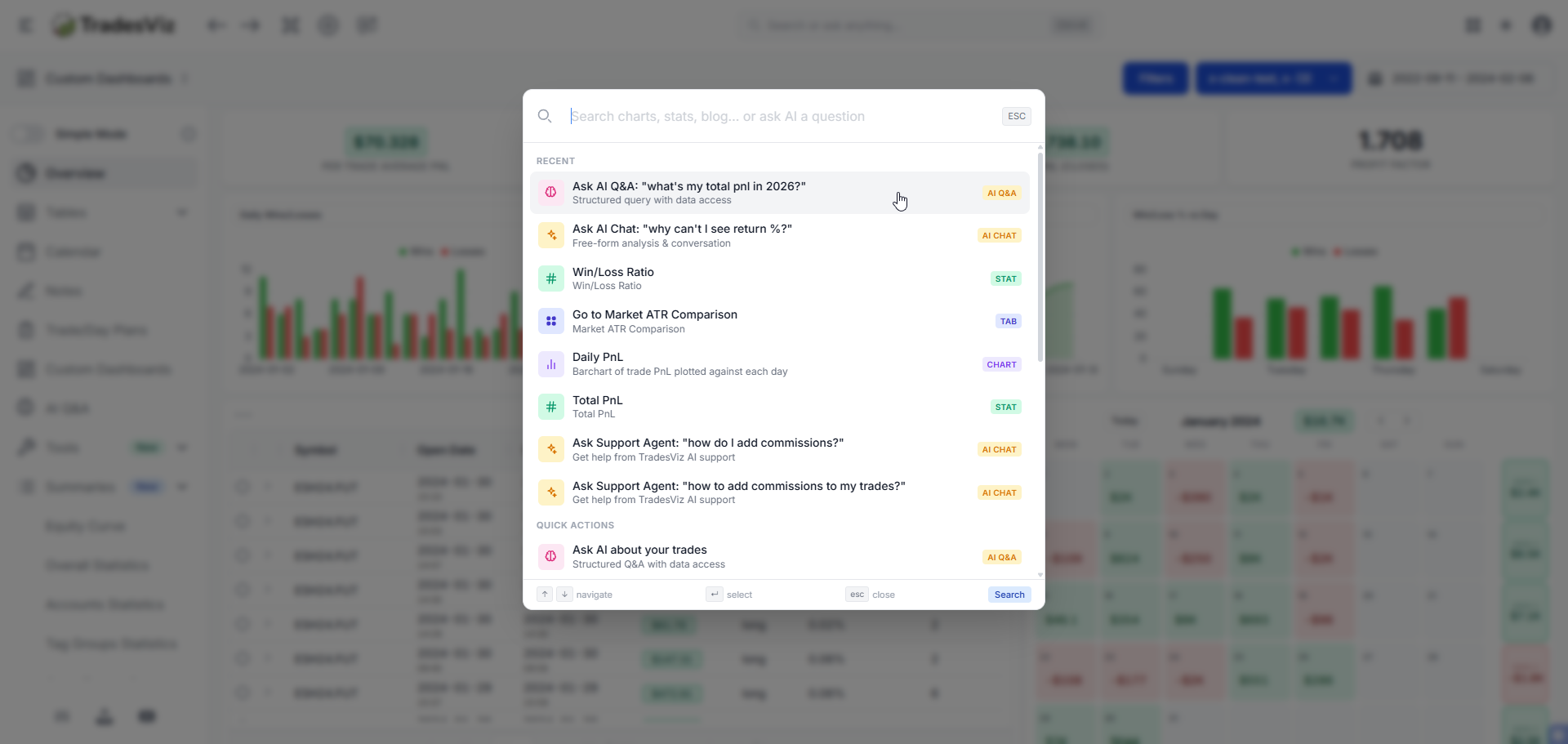 - Command Search Center: A new Ctrl+K style command palette for quickly navigating to any page, feature, or setting in TradesViz. Search for anything - tabs, tools, settings - and jump there instantly.