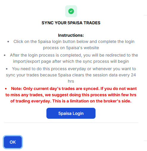- You need to sync your trades every day so that you do not lose information - 5paisa API only provides information for trades executed on any given day. For example, you cannot sync yesterday's trades today.