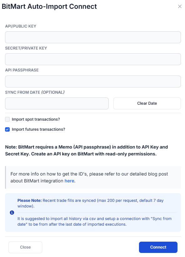 Important: BitMart's API returns trade history with a default window of 7 days. If you have older trades, we recommend first importing them via CSV and then setting up the auto-sync connection with a "Sync from date" set to after the last date of your imported executions.
