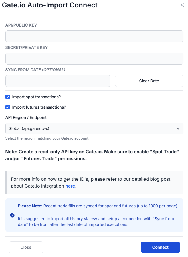 - Go to TradesViz auto-import page, select "Gate.io" as your broker, and enter the API Key and Secret Key in the connection popup.