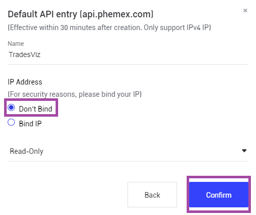 - Now enter the name for the API as TradesViz and select "Don't Bind" under IP addresses seciton