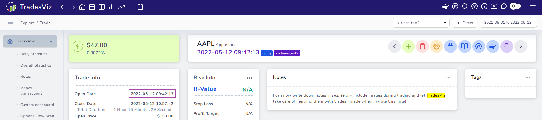 This eliminates the step of writing down your notes on another platform or trying to remember them. Since TradesViz already helps you by plotting the trades on various charts, with this feature, you can do real-time journaling without losing any information and with very little effort!