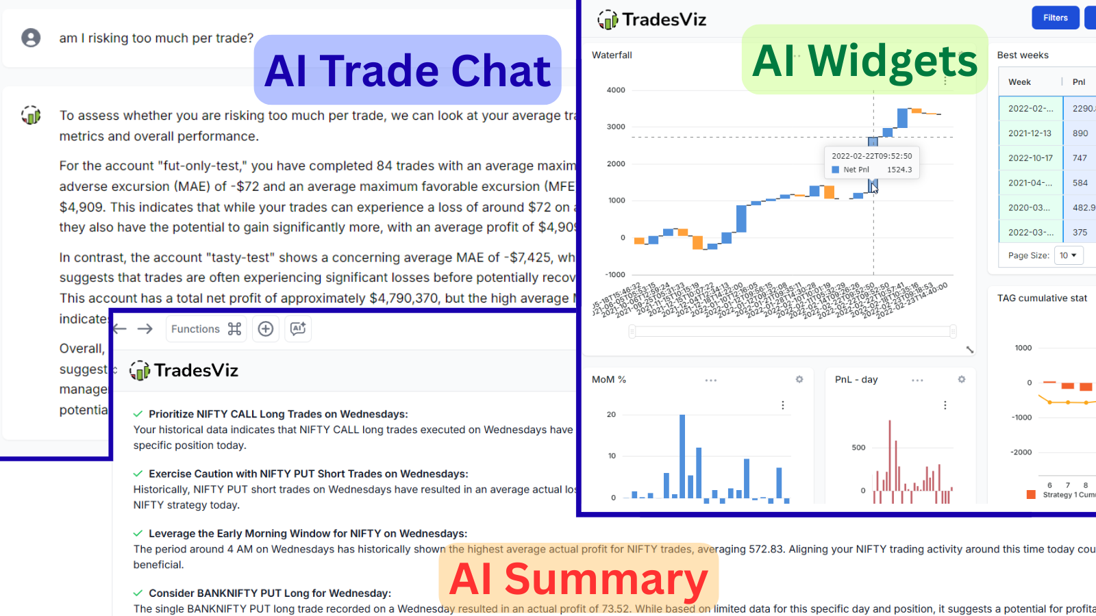 - "Latest AI" technology gets you a canned paragraph that says you perform better on certain days. (TradesViz introduced AI Q&A in 2023)