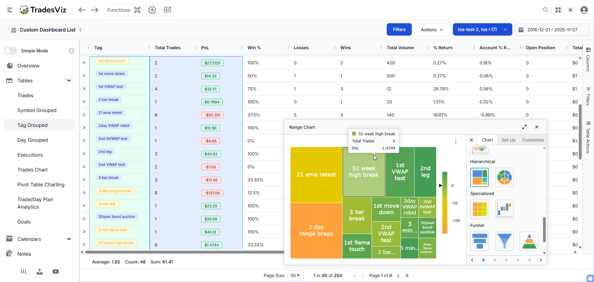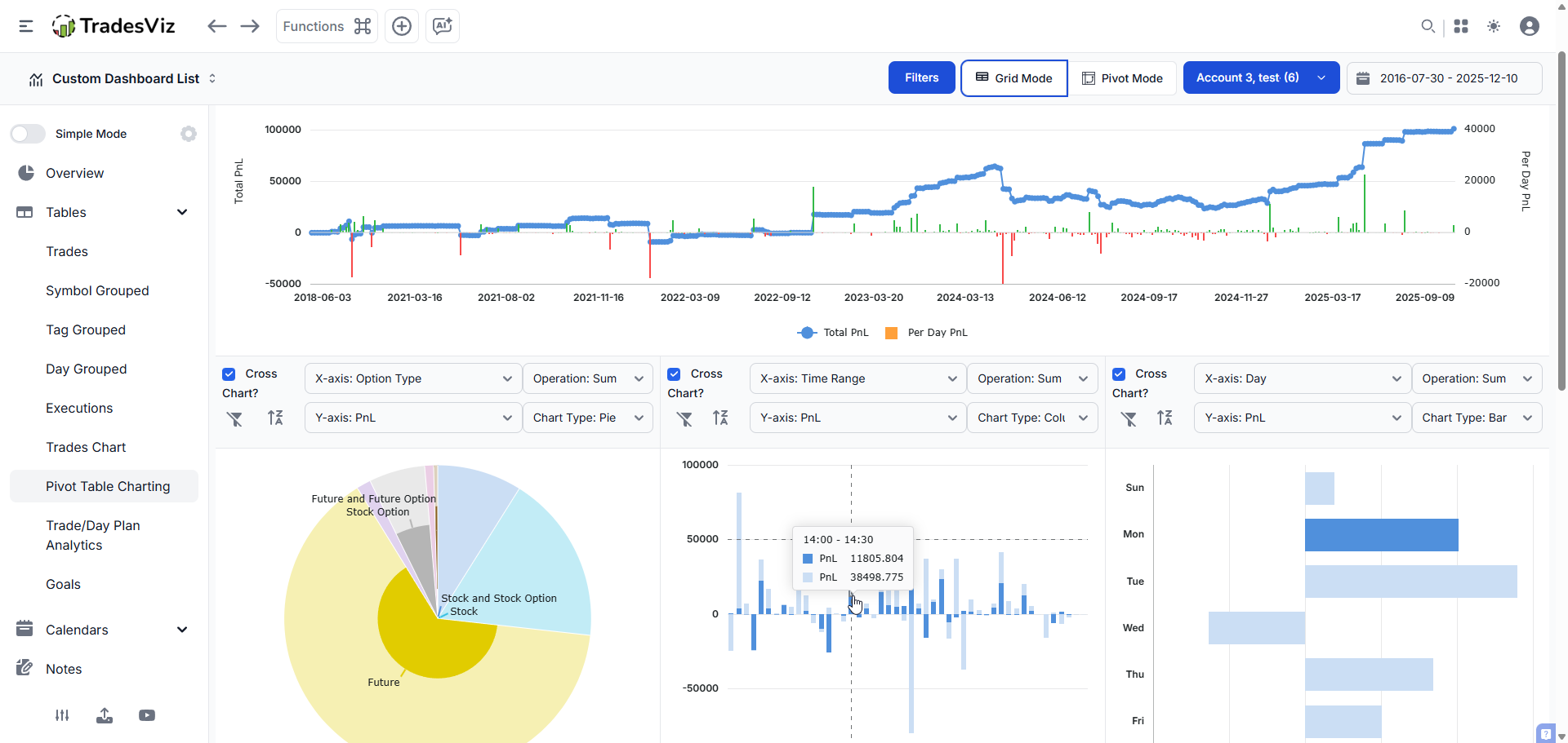 TradesViz built an all-in-one pivot grid where any column or data can be visualized and explored intuitively. Potential combinations of metrics: 600+.