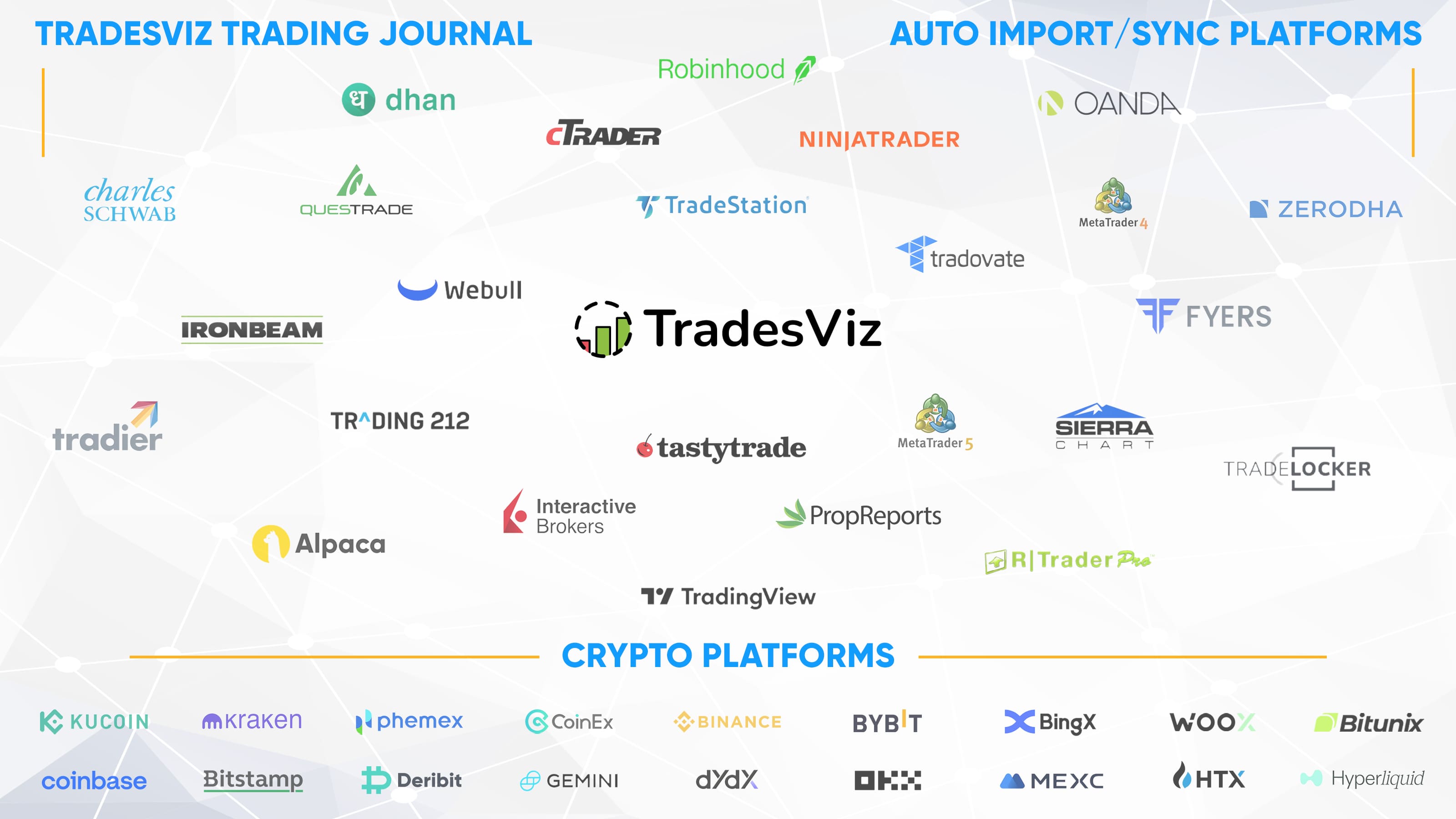 TradesViz supports auto-sync and manual import from 200+ brokers and platforms.