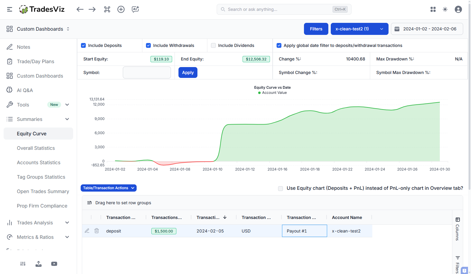 Once you are funded and receiving payouts, you do not need a separate tracking tool. TradesViz already has a full deposits and withdrawals system built into the Equity Curve tab. Use it to log every payout, fee, and account adjustment: