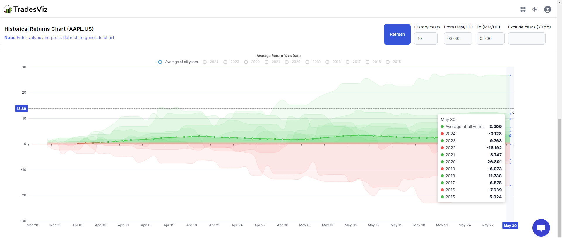 At the bottom half of this page, you are able to select any date range in MM-DD format and view the return chart for that period. For example, below, we have selected the range of 03-30 (March 30th) to 05-30 (May 30th) for the last 10 years.