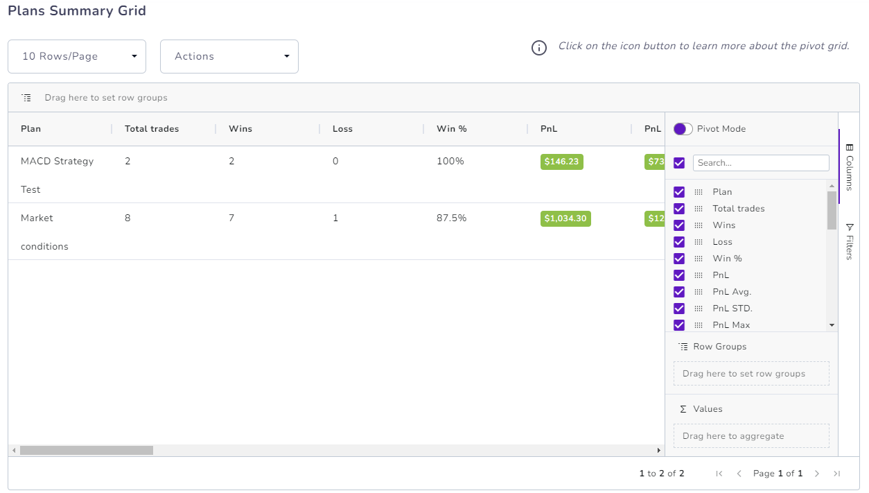 At a glance, you can find what trade/trading day plans work for you. It is important to note that for the trading day plan, we take all the trades that were *opened* on the day on which the plans were added.