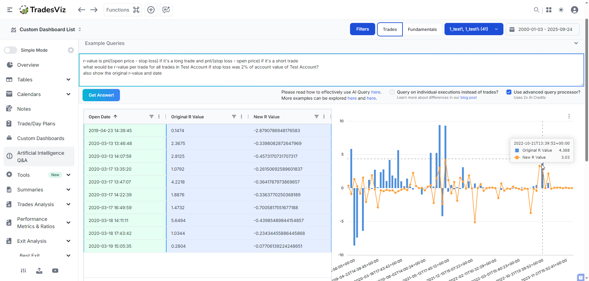 TradesViz has processed over 50,000 unique AI queries. Each of these queries serves a very specific purpose for the trader who generated it, and they can use it in their custom dashboard. Now, why do we need this? Even though the TradesViz dashboard is extremely comprehensive in its analytics offering, it is impossible to cover 100% of the use cases traders have. To solve those custom cases and to allow users to have full control over their data, all whilst still guaranteeing privacy (even if we use state-of-the-art LLM/AI systems), we introduced this. TradesViz was the first online trading journal to introduce AI in journaling. Our AI Q&A remains the most popular, widely used, and only functioning AI system in journaling.