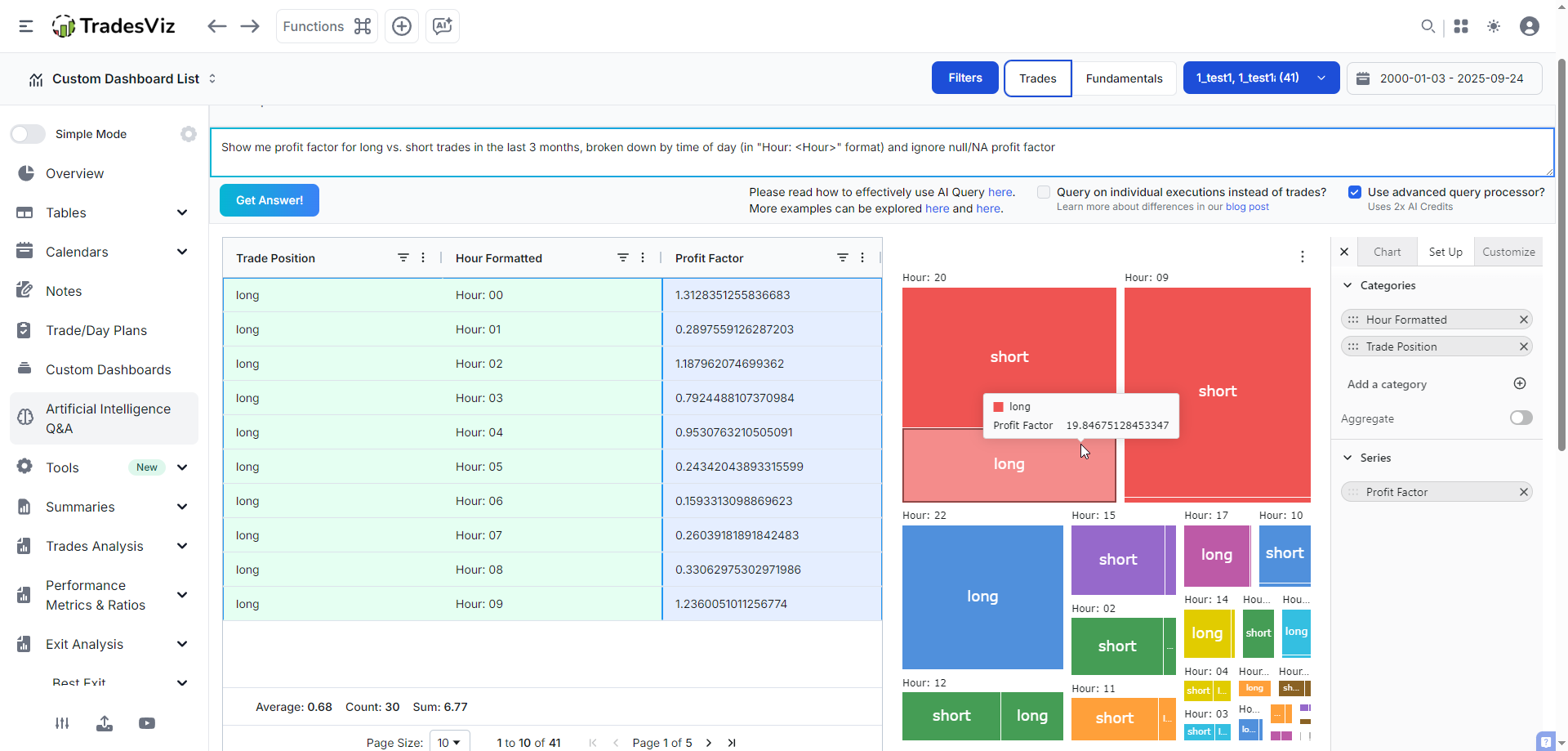 - "Show me profit factor for long vs. short trades in the last 3 months, broken down by time of day"