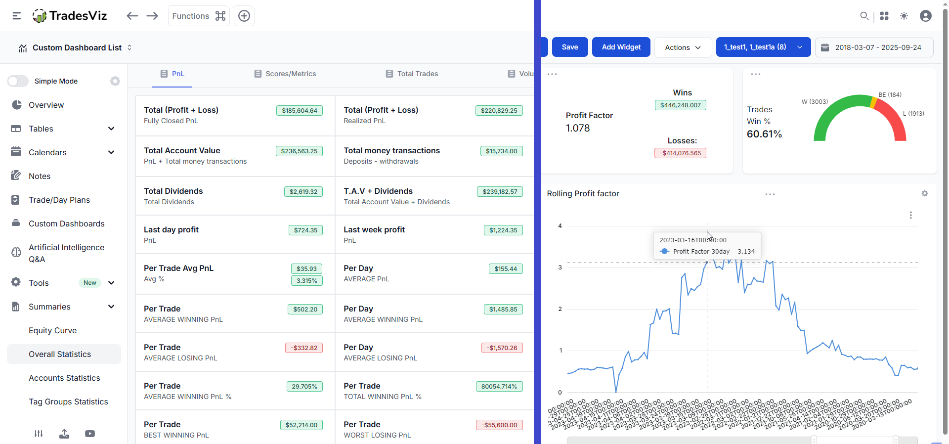 TradesViz's Custom Dashboard feature lets you create a personalized command center for monitoring your Profit Factor in real-time. With the latest dashboard widgets, you can: