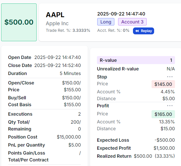 - If the trade hits your stop loss at $145, you lose $500 -> This is an R-value of -1 -> You've lost exactly the total amount you've risked.