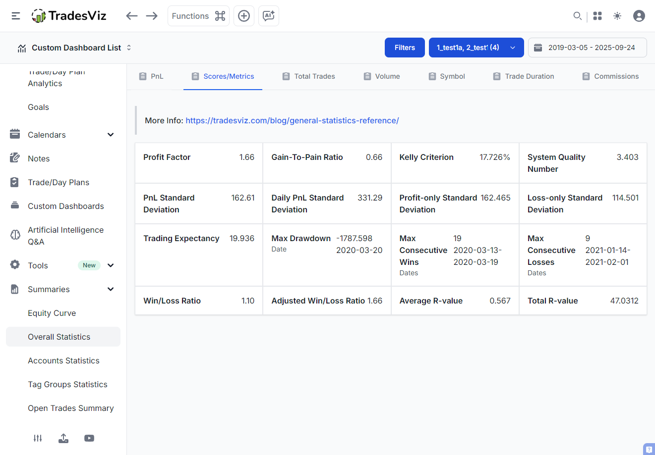 The General Statistics page doesn't just show you a number - it provides context on what you can look to improve. You'll see how your R-Value trends over time, helping you identify whether your trade quality is improving or deteriorating.