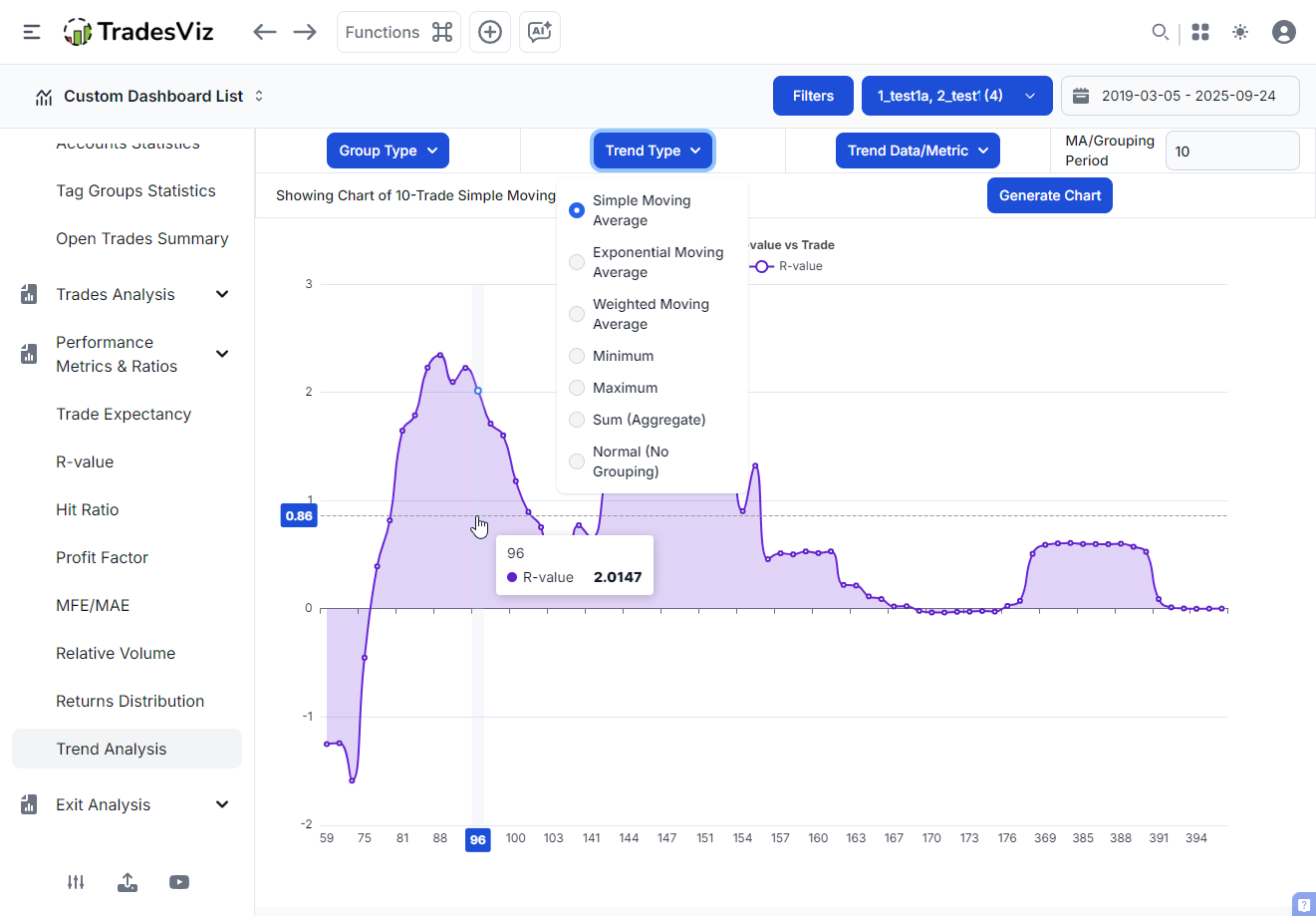 TradesViz trading journal's trend analysis tool helps you do exactly this for R-value (and for many other trades) on a per-trade or even per-day basis. But what does this mean?