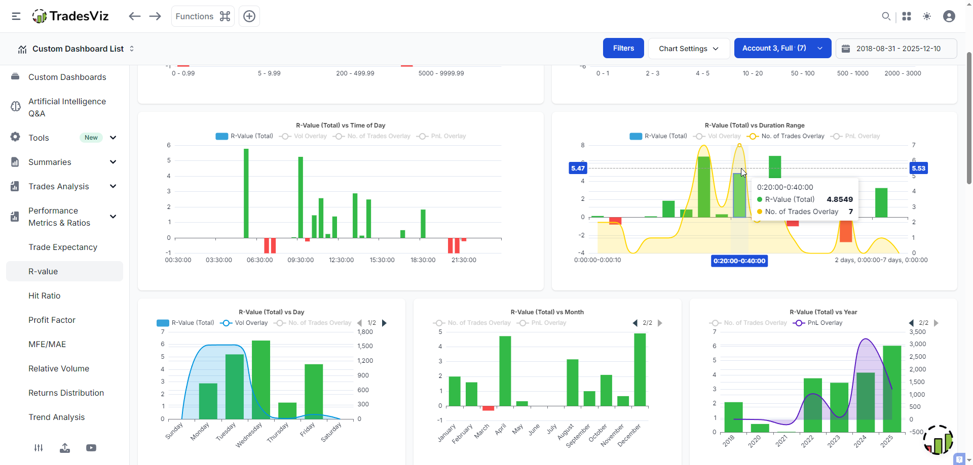 The Charts & Statistics section transforms your R-Value data into powerful visual insights. TradesViz has pre-build charts for R-value under the performance metrics and ratios section.