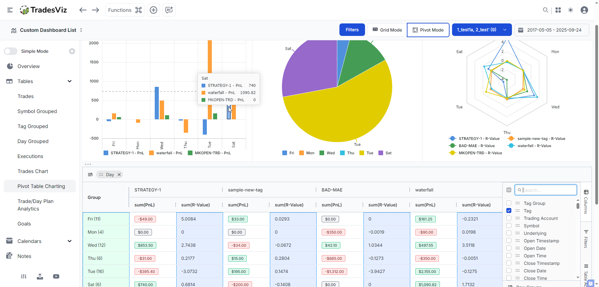 The table shows you a breakdown of each pnl on each day of the week, pivoted by the tag. You can also include multiple numeric columns (we have a dedicated blog post exploring the pivot grid, so you can check that later). The charts above the table are visualizations that you can choose to visualize the stats of the table. From the left, we have a barchart of the pnl of tags (as classes) plotted versus day of week, then a single tag's pnl in a pie chart, all tags' R-values versus the day in a Radial (radar) chart.