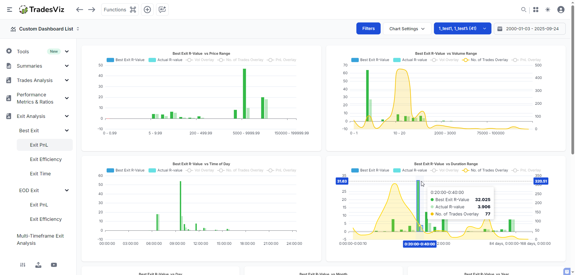 - Time-based Performance: Analyze how R-Value changes based on hold time (Read more in our Analysis of duration to MFE and MAE blog post)