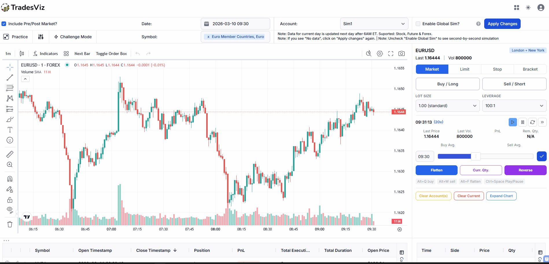 Many forex traders prefer to test strategies by hand, placing orders as historical price unfolds. The forex simulator replays any historical session with 5-second bars and up to 100x speed, bracket orders with pip-based stops, multi-chart layouts and built-in position sizing.