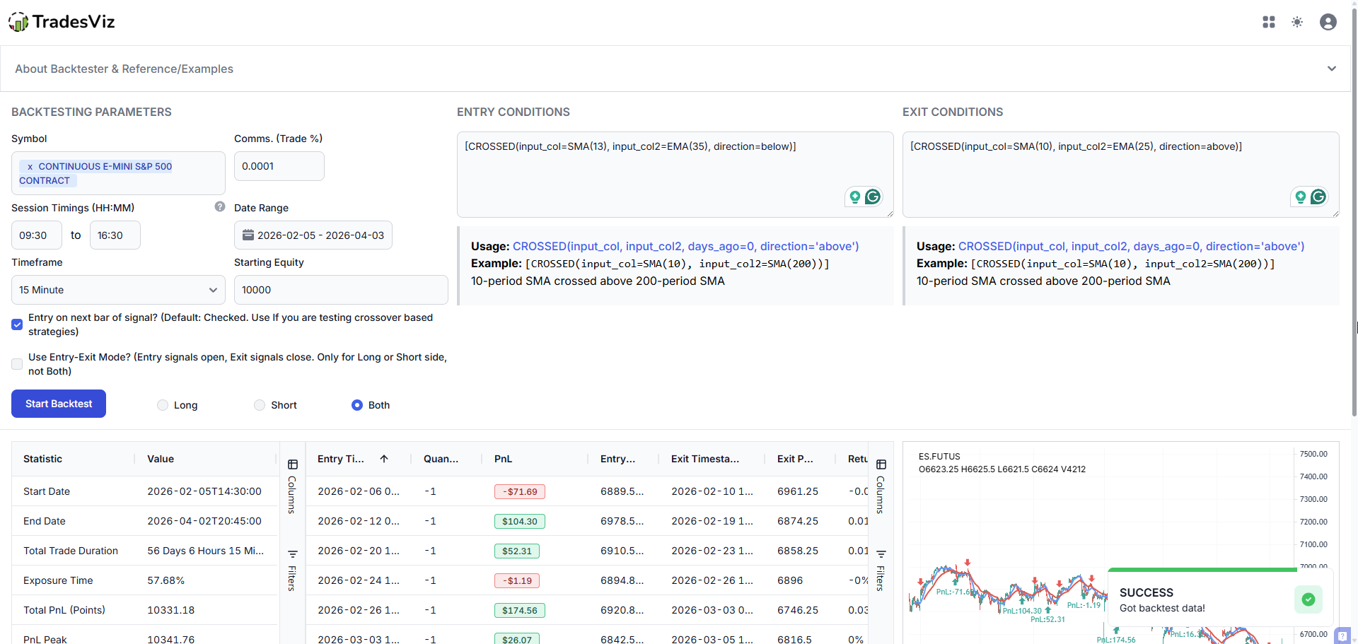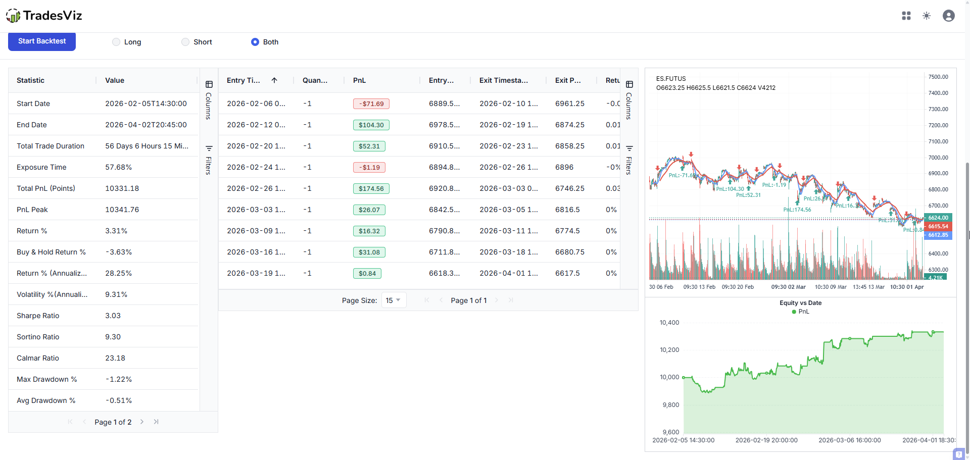 Automated backtesting runs a rule-based strategy (built from indicators) across historical data and produces statistics like Sharpe Ratio and Win Rate without any manual intervention. Manual backtesting (simulation) replays historical price data bar by bar so you can place orders by hand and practice execution. TradesViz is one of the few platforms that offers both on the same futures data.