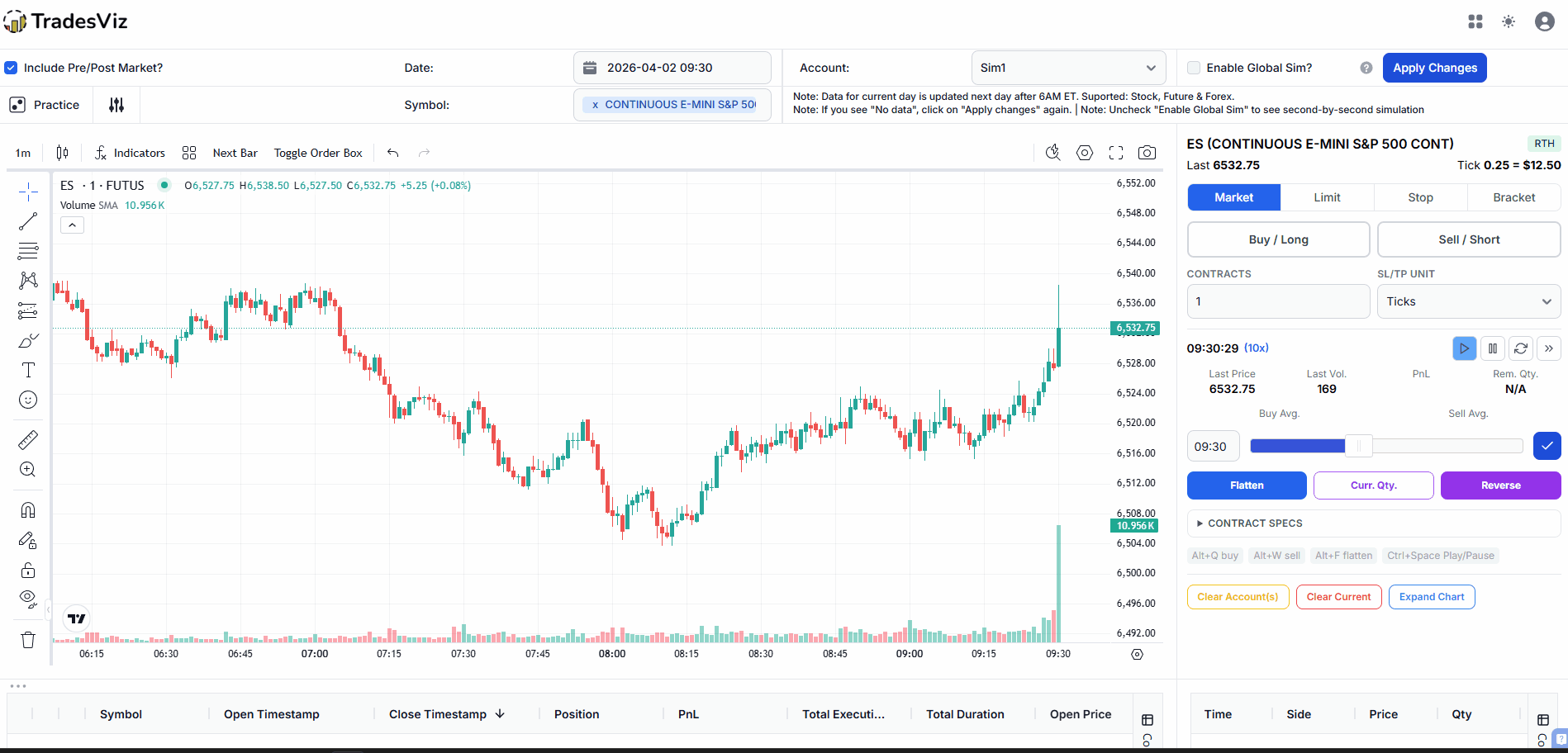 Many traders prefer to test strategies by hand, placing orders as historical price unfolds. The futures simulator replays any historical day with 5-second bars and up to 100x speed, bracket orders with tick-based stops, multi-chart layouts and contract-aware risk management.