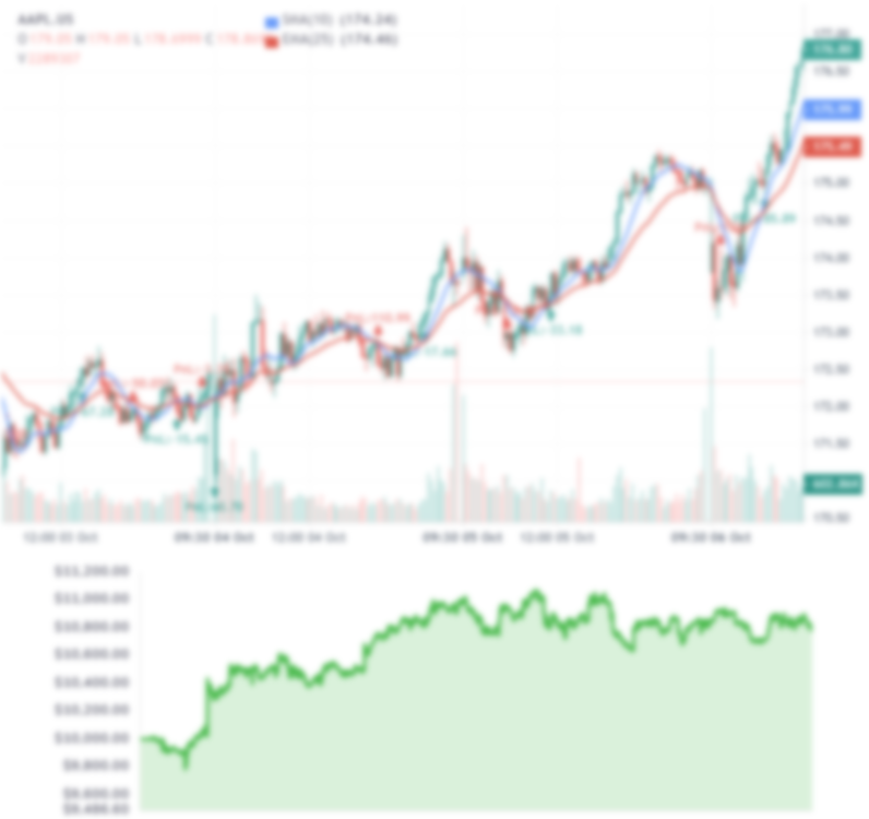 Run the same strategy on AAPL, then TSLA, then SPY and compare results side by side to see how a strategy behaves across different volatility profiles. Every backtest produces 20+ statistics, an equity curve, and trade markers plotted on the chart.