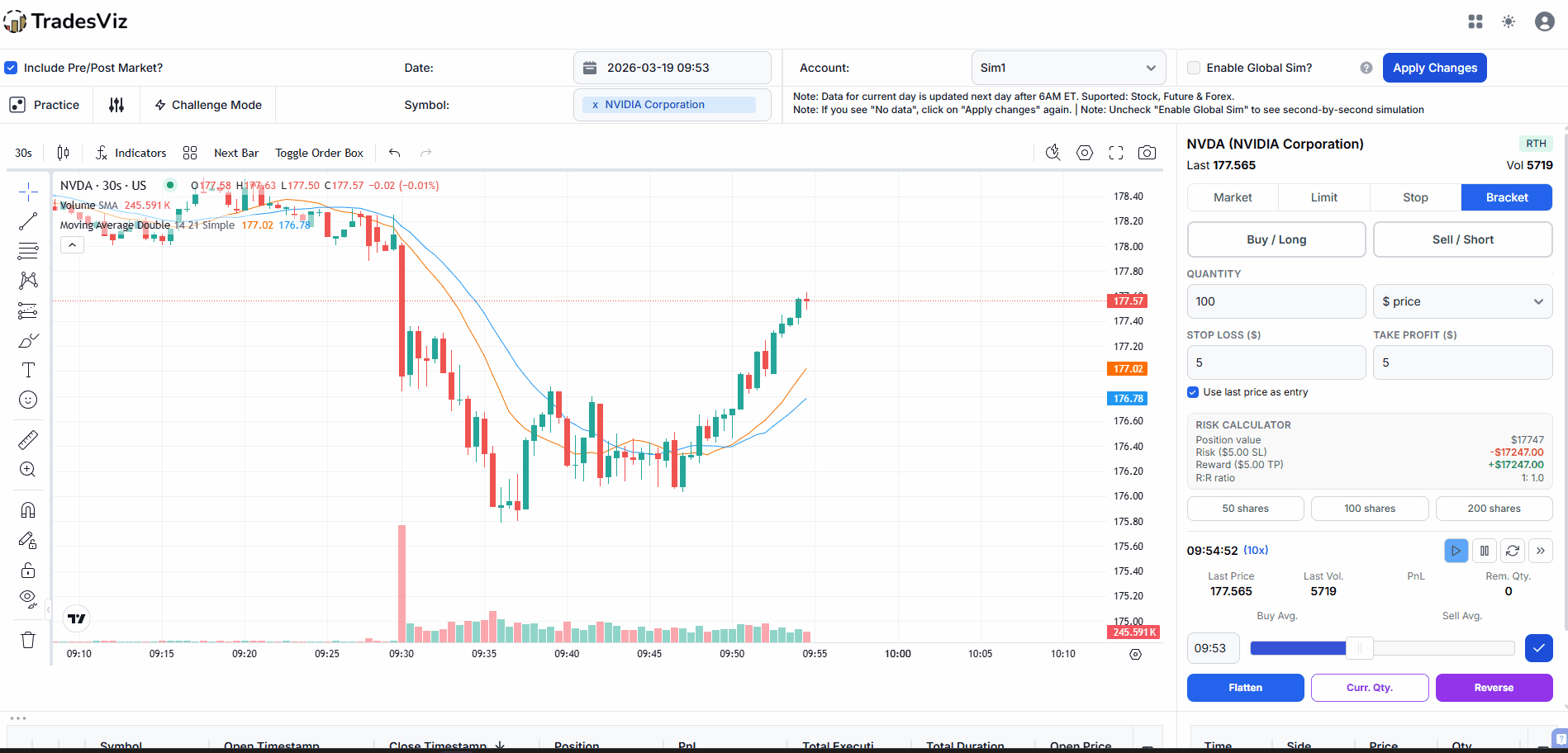 Many traders prefer to test strategies by hand, placing orders as historical price unfolds. The stock simulator replays any historical day on any of 30,000+ symbols with 5-second bars and up to 100x speed, bracket orders with flexible stops, multi-chart layouts and built-in position sizing.