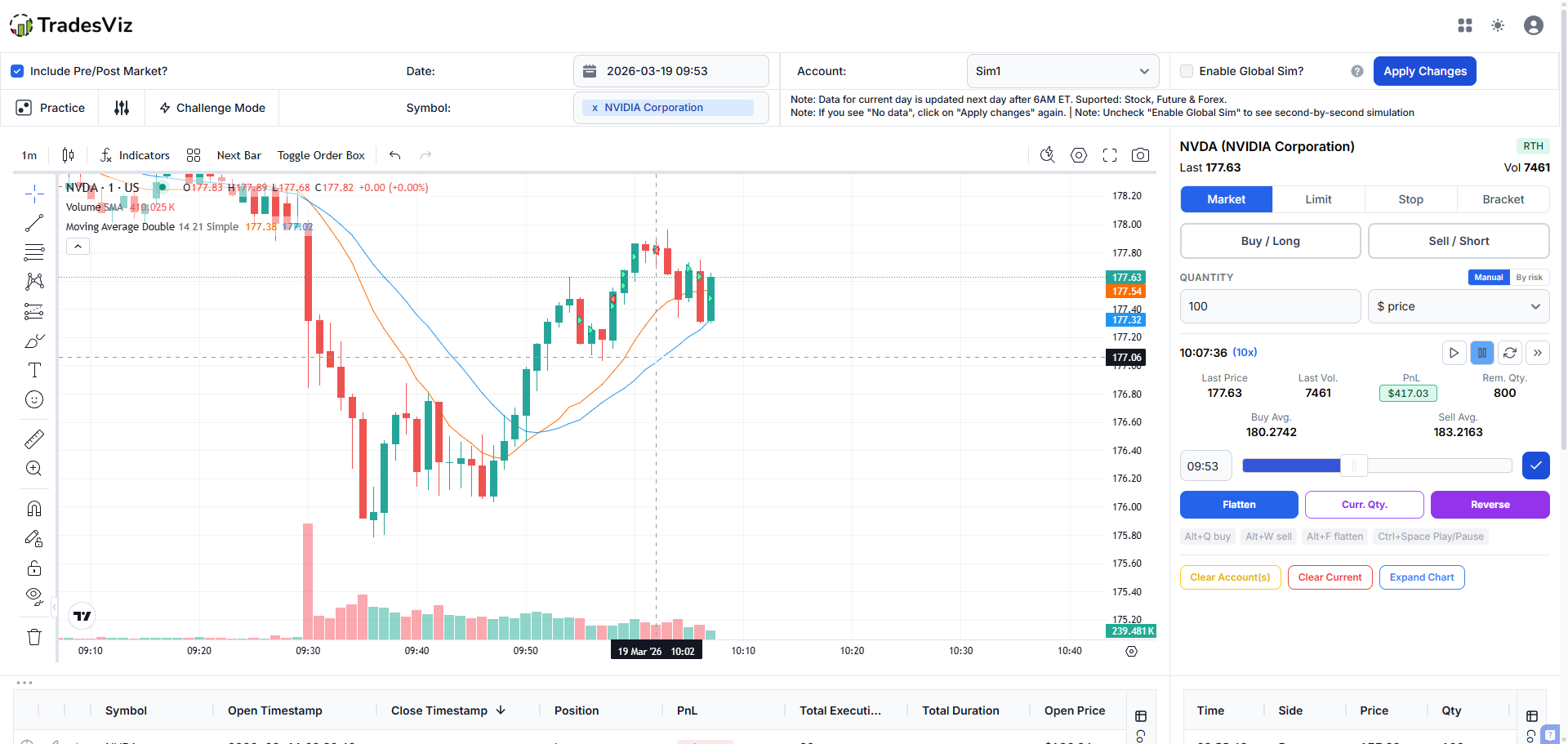 Load AAPL, TSLA, SPY or any supported symbol. Choose any historical date and set the bar timeframe and playback speed.
